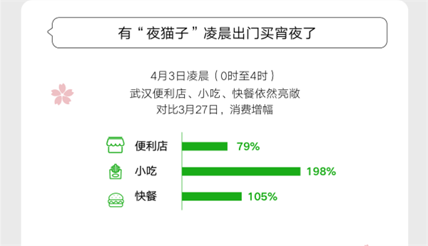 有意思的是,武汉的夜生活也开始有了暖意。与3月27日相比,武汉老百姓在4月3日当天宵夜格外热闹,凌晨0点到4点,“夜猫子”都爱光顾的小吃和快餐生意回暖,增幅分别达到了198%和105%。