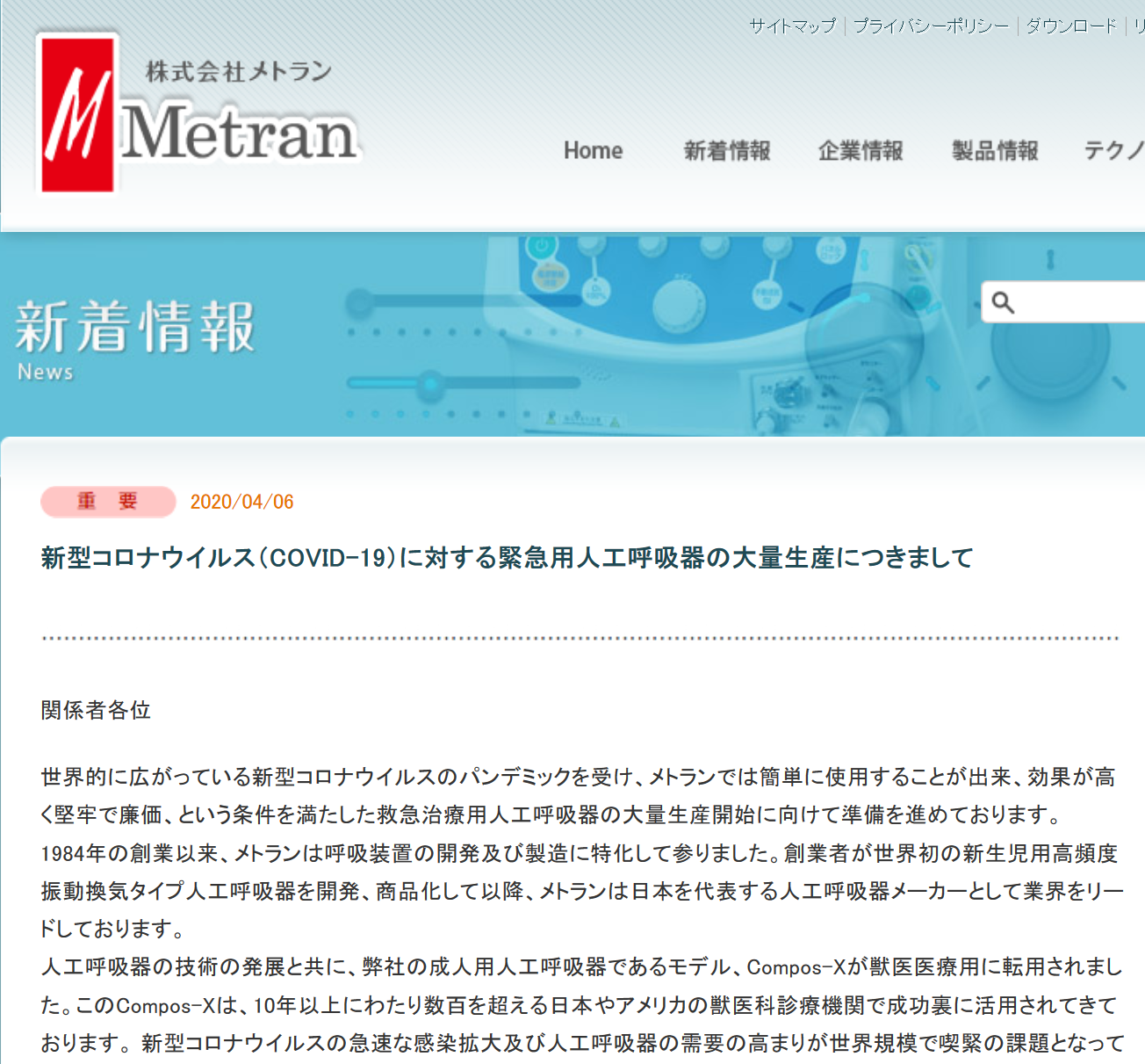 日本当地时间4月6日,据外媒报道,一家名为Metran的医疗设备制造商称,日本政府已联系其公司大量生产动物呼吸器,以便用于治疗新冠病毒患者,其他国家也对此表示出兴趣。目前该公司正在与美国、英国和印度等30多个国家谈判。