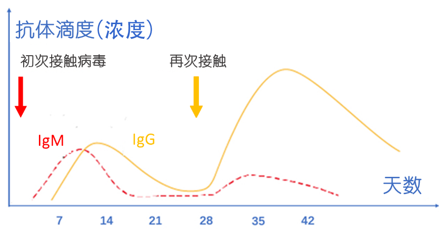 第一次遭遇病毒时,人体免疫应答中最早产生的是IgM抗体,它的出现提示感染正处于急性期,也是病毒传染力较强的阶段。随后IgG抗体出现,它是发挥保护作用的主力军,在恢复期抗体滴度可达到急性期的4倍以上,并在体内持续存在数年以上。IgG阳性提示感染进入后半程或者曾经被感染过,此时传染力相对较弱。