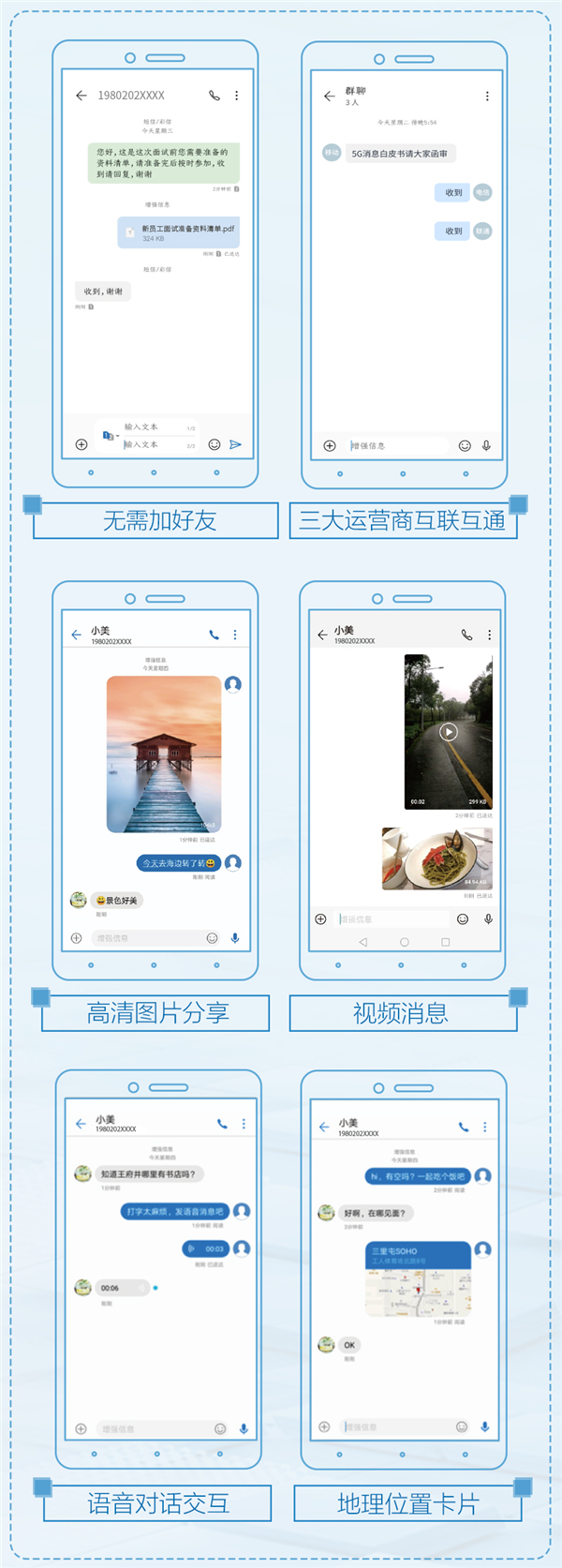 针对个人用户,5G消息提供点到点消息和群聊服务,除文本外还支持图片、音频、视频、位置、联系人等多种形式,而且用户无需下载客户端,无需添加好友,就能收发其他手机号用户的5G消息。