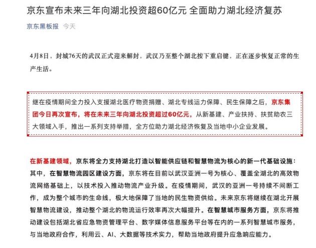 京东集团表示,将充分发挥自身优势,全面开放多年来锻造的供应链、物流、技术、服务等核心能力,通过一系列支持举措,为湖北经济复苏激活贡献自己最大的力量。