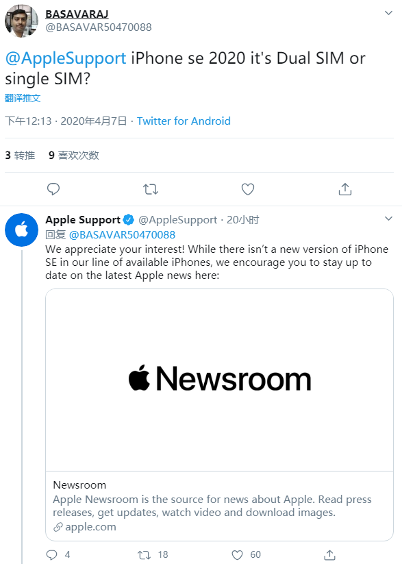本以为新款iPhone SE已经板上钉钉,没成想苹果按兵不动,迟迟不发。有猜测是因为因疫情中断供应链导致备货不够,也有猜测是目前海外的Apple Store直营店大量停摆,苹果认为还没有等到最佳的发布窗口。日前,有印度网友在社交平台上询问苹果官方支持账号,2020款iPhone SE是单卡还是双卡。