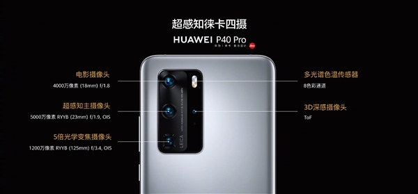 P40 Pro后置超感知徕卡四摄,包括5000万像素主镜头(F1.9/广角/OIS)、4000万像素电影镜头(F1.8/超广角)、1200万像素长焦镜头(F3.4/OIS)、ToF 3D深感摄像头,业界首创超感光潜望式长焦摄像头,支持5倍光学变焦、10倍混合变焦、50倍数字变焦。
