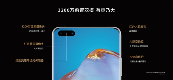 前置摄像头方面,P40配备3200万像素主镜头(F2.0)+红外摄像头,P40 Pro则是3200万像素主镜头(F2.2/自动对焦)+景深摄像头,均支持4K录像。