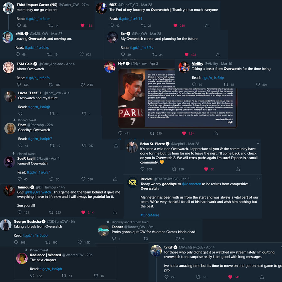 Twitch主播兼YouTuber Eskay近日在Twitter上分享了一张图,总结了很多宣布离开《守望先锋》的玩家,其中不乏有职业玩家。
