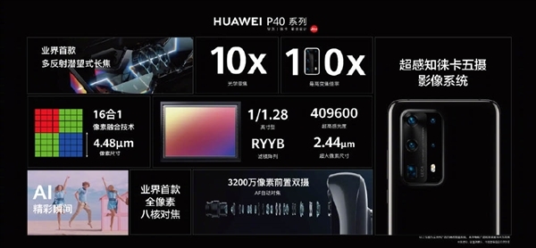 拍照方面,P40 Pro后置超感知徕卡四摄,包括5000万像素主镜头(F1.9/广角/OIS)、4000万像素电影镜头(F1.8/超广角)、1200万像素长焦镜头(F3.4/OIS)、ToF 3D深感摄像头,业界首创超感光潜望式长焦摄像头,支持5倍光学变焦、10倍混合变焦、50倍数字变焦。