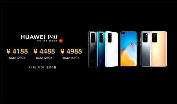 售价方面,P40的6GB+128GB 4188元、8GB+128GB 4488元、8GB+256GB 4988元,今晚22点08分正式开卖,将分别在4月11日、4月18日前发货。