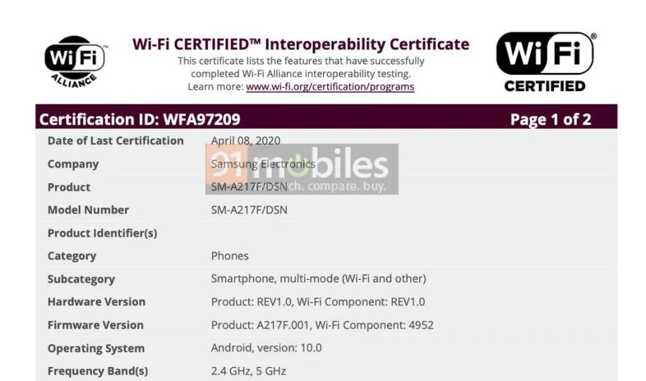 A21近日通过了Wi-Fi联盟的官方认证,确认该机支持双频Wi-Fi,运行Android 10系统。除此以外,Wi-Fi