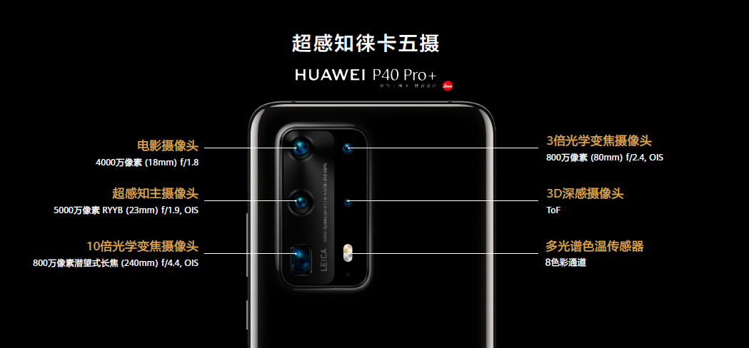 华为P40 Pro+搭载超感知徕卡五摄,包含5000万像素超感知主摄像头、4000万像素电影摄像头、10倍光学变焦摄像头、3倍光学变焦摄像头、和一枚3D深感摄像头;同时,华为 P40 Pro+业界首创100倍双目变焦,支持3倍中远距光学变焦、10倍超远距光学变焦、20倍混合变焦以及最高100倍双目变焦。另外,P40 Pro+超感知主摄像头和两颗光学变焦摄像头均支持OIS光学防抖,并引入AIS智慧防抖,实现三重OIS+AIS防抖,将大小抖动化为无形,让每一次拍摄充满期待。
