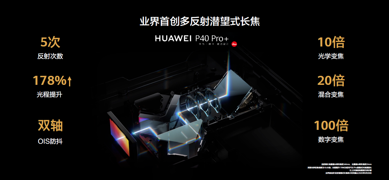 而华为则研发出了潜望式摄像头,通过让光学在多个镜片间折射,延长光的路程,从而在手机上实现了高倍数光学变焦。华为P30 Pro已经支持了5倍光学变焦,而华为P40 Pro+则是翻倍,达到了10倍光学变焦。华为P40 Pro+搭载第二代潜望式摄像头,光路经过5次反射,光程比华为P30 Pro增加了178%,在不到1cm的机身内实现了10倍光学变焦,是迄今为止手机光学等效最长的摄像头。