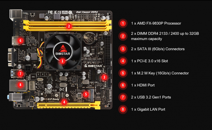 今天,映泰又发布了一款“A10N-9830E”,仍旧是ITX迷你板U套装,集成的处理器还是FX-9830P,整体设计和规格和之前那款FX9830M非常相似,只有一些细节上的微调。