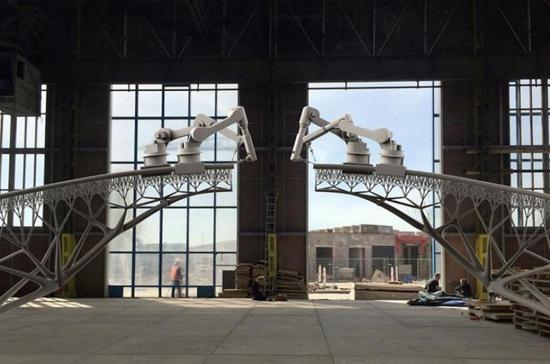该团队最酷的项目之一是MX3D桥。他们在阿姆斯特丹市中心最古老、最著名的运河之一Oudezijds Achterburgwal上打印了一座功能完备的不锈钢桥。这座人行桥长12米,具有令人惊叹的未来主义设计。建造过程中,该团队使用了两个工业机器人,让它们分别从桥的一头开始打印,最终在桥的中间汇合。