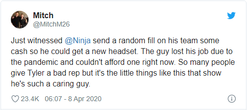 从 Twitch 跳槽到 Mixer 流媒体直播平台之后,Ninja 依然保有相当高的人气。在近日兴起的《Valorant》比赛中,热心的 Ninja 再次向因新冠病毒流行而失业的僚机伸出了援手。起因是 Ninja 奇怪他为何没有听到敌方从后侧逼近,队友解释称他几个星期前就想买一副新耳机了。可惜由于工作被砍,他只能这么节衣缩食地过下去。