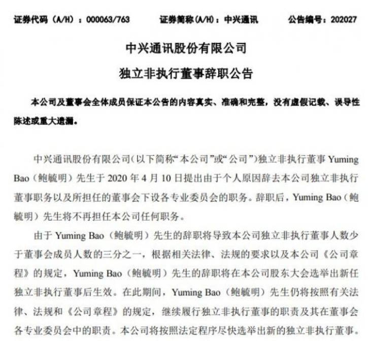 中兴通讯随后发布公告称,独立非执行董事鲍毓明辞职后不再担任公司任何职务,根据相关法律、法规的要求以及本公司《公司章程》的规定,鲍毓明先生的辞职将在本公司股东大会选举出新任独立非执行董事后生效。
