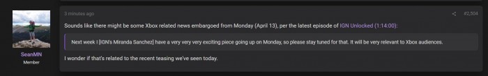 根据IGN的Miranda Sanchez在ResetEra论坛上发布的消息,下周一(4月13日)将有一则非常非常激动人心的消息公布,是与Xbox玩家密切相关的。