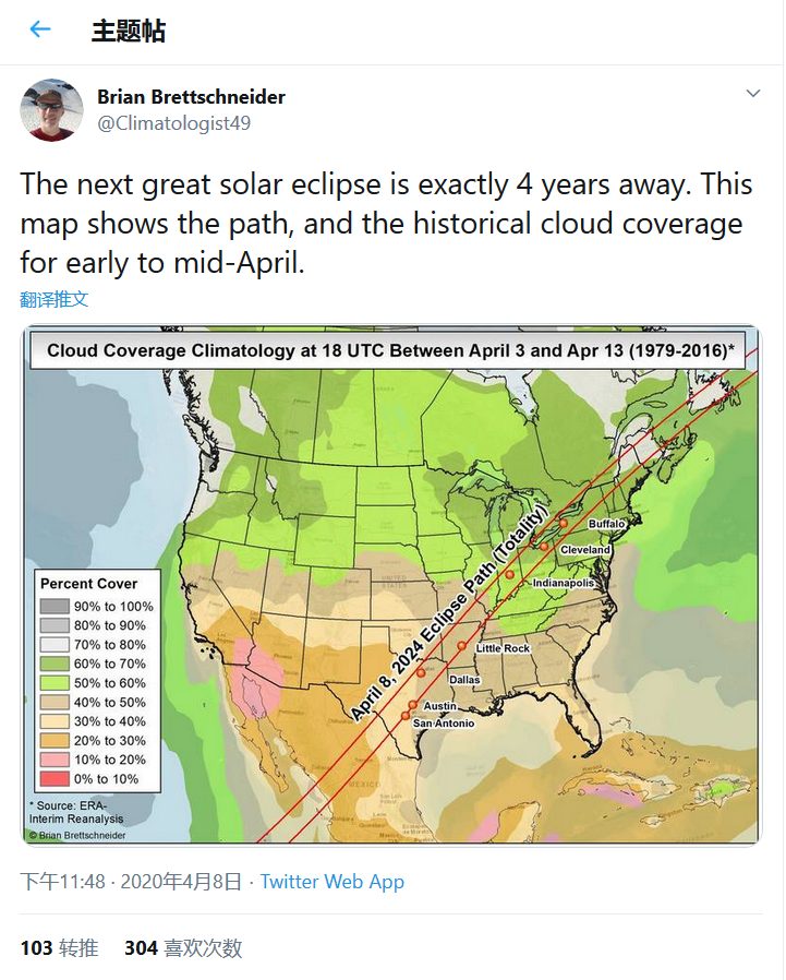 在推文中写道:“下次日全食恰好是4年后的今天。这张地图显示了日食的轨迹,以及4月上旬至中旬的历史云层覆盖情况。”