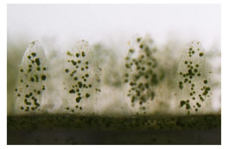 得益于这些晶体,加上“骨骼”中的杯状形状和圆柱形结构,3D打印的珊瑚在吸收光线并将光线引导到藻类上的效果要比真实的珊瑚好得多。事实上,当一种名为Marinichlorella kaistiae的商业微藻菌株被纳入材料中时,这种藻类在标准液体生长介质中生长的密度是天然珊瑚上的100倍。