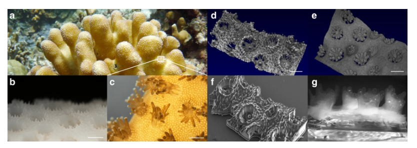 这种生物相容性的合成珊瑚是通过剑桥大学和加州大学圣迭戈分校的研究人员合作生产的。他们利用了一种基于光的快速生物打印技术,可以在几分钟内制造出微米级分辨率的物体。每一块打印出来的珊瑚都包含一个“骨骼”,支撑着被描述为 "类似珊瑚的组织 "。“骨骼”由一种称为PEGDA的生物相容性聚合物凝胶制成,其中加入了纤维素纳米晶体。同时,该组织由一种名为GelMA的明胶基聚合物水凝胶组成,它与活的藻类细胞和更多的纤维素纳米晶体结合在一起。