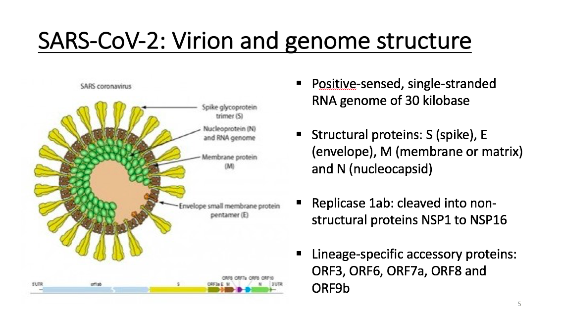 冠状病毒的结构(图),以SARS冠状病毒为例,SARS-CoV-2和它非常类似。结构中黄色对应的是纤突蛋白,绿色的是核衣壳蛋白,灰色的是膜蛋白,这些是结构蛋白。其基因组在5'端大部分是开放阅读框1(ORF)1ab,它是一个复制酶,然后是一些蛋白编码区在基因组中的相对位置。除了以上提到的,这个病毒里还包含一些小的蛋白,0RF6、ORF7a、ORF8、ORF10等等,这些蛋白是谱系特异性的,主要是负责和宿主相互作用的辅助蛋白。这个冠状病毒是单股正链的RNA病毒,大概有3万个核苷酸。它的复制酶会被宿主蛋白酶水解,成为多种非结构蛋白。