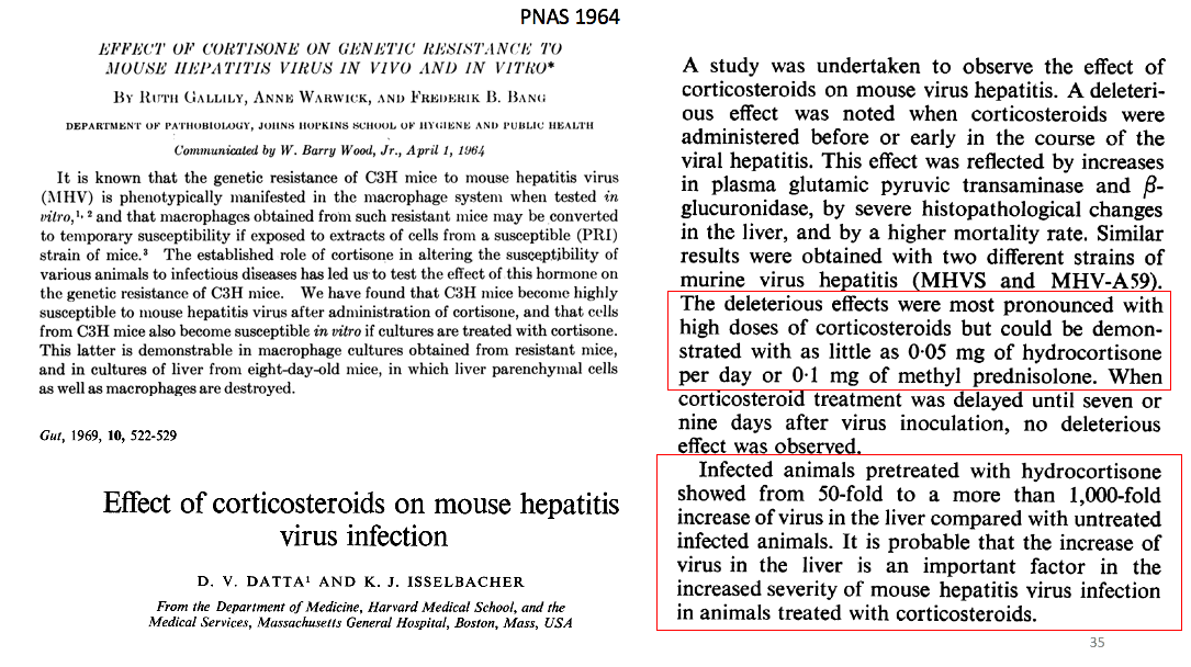 再讲激素,激素对冠状病毒的作用很久之前就有很好的研究。1964年发表于PNAS的工作发现老鼠或者细胞不能被小鼠肝炎病毒感染的,如果给予激素马上就能被感染。1969年发表于Gut的论文从细胞水平到动物水平都进行了非常细致的研究。我想提醒大家注意的是,他们看到高剂量类固醇促进病毒复制并增强病理反应的效果最强,但即使每天仅使用低剂量的0.05mg氢化可的松或者0.1mg的泼尼松龙仍然可以看到对病毒复制的刺激效应。类固醇的使用能刺激病毒复制50到1000倍。对于SARS-CoV,当年香港总结的经验也是认为类固醇使用会造成更多的死亡,而且病情也更严重。对于MERS的研究也清楚表明类固醇会延长病毒的清除。