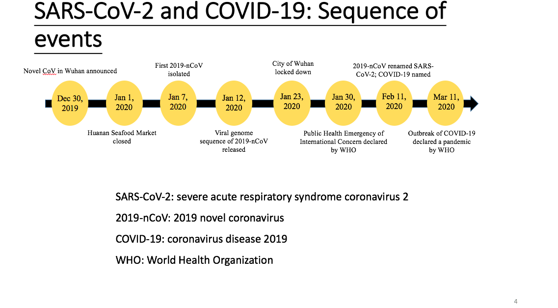 这里有几个名称,SARS-CoV-2,这是国际病毒命名委员会给新病毒的命名,当然有些科学家对此有不同意见,规范起见我们还是叫它SARS-CoV-2,另一个名字是2019新冠病毒,世界卫生组织就叫做它2019年冠状病毒病也就是COVID-19,SARS-CoV-2和COVID-19这两个专有名词我们会在讲座中提到。