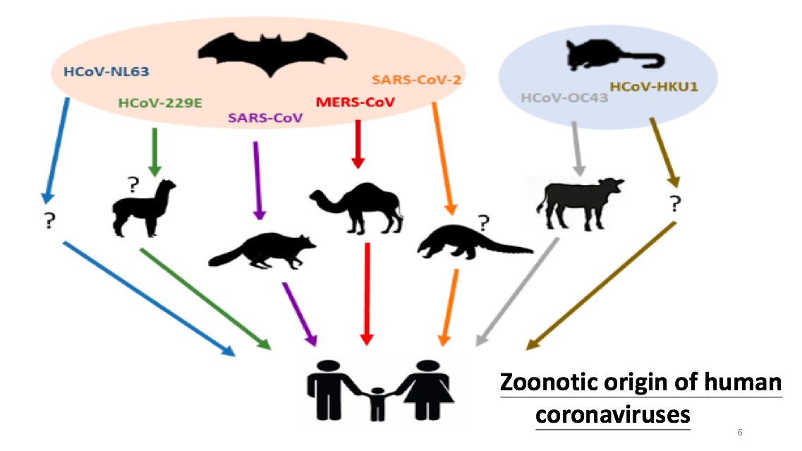 再回过来说一下MERS-CoV的中间宿主单峰骆驼,MERS-CoV最早来源于蝙蝠,但是病毒在骆驼里已经适应了,所以骆驼从一个中间宿主也变成了储存宿主。该病毒感染骆驼后致病性比较低,不会把骆驼杀死。有一个重要的信息要提醒大家注意,这四种现在只引起普通感冒的人类冠状病毒,它们以前是怎么样的呢?有历史记载的线索表明OC43在1890年前后从牛传播到人,牛的OC43病毒和人的很像。1890年前后当时也有一次呼吸道病毒的全球大流行,病征有点像SARS-CoV-2,是比较严重的。所以有一种观点认为,只引起普通感冒的这四种病毒,当它们第一次从动物传到人的时候,也引起过一次比现在症状要严重的全球大流行,这也是回顾人类冠状病毒的历史给我们的一些启发。