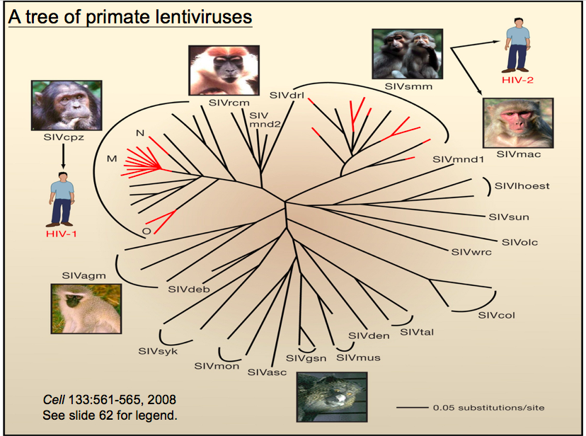我们研究病毒的人,很多都想到HIV里面找一些答案或者找灵感和思路。我快速地介绍一下HIV到底是如何从动物来的。经过很多病毒学家多年的追踪,他们发现目前在人里面有两种HIV:HIV-1和HIV-2。其中HIV-1来自于黑猩猩,HIV-2来自于白顶白眉猴。但是再深入的追踪后发现其中还有很复杂的关系。HIV-1是由黑猩猩传到人,但是传染其实发生了多次,其中一次M组传染人数最多,O组其次,N就是只有很少的人。HIV-2也发生了很多次,但是只有一次或者两次是在人群中存留下来了。我们比较它们基因组的差异、进化关系、地理位置是否重合等,最后找出了原因,人们食用动物或者拿它们当宠物造成了病毒从动物到人的传播。