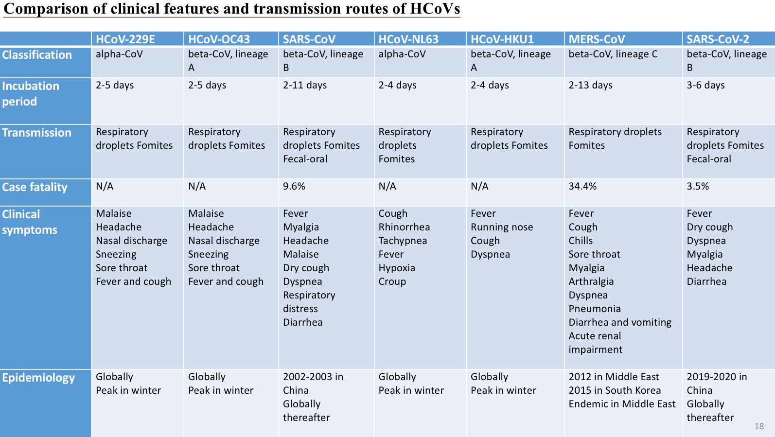 (图)这张表比较了这7种不同冠状病毒的特点,潜伏期多数在一周内,MERS和SARS稍微长一点,SARS-CoV-2大部分还是比较短的,介于这两者之间。人类冠状病毒有季节性,但是SARS-CoV-2是否具备季节性还是未知的。但总体来讲它的致死率是比较低的,前段时间全世界的统计致死率只有3.5%,现在可能更高了一些。