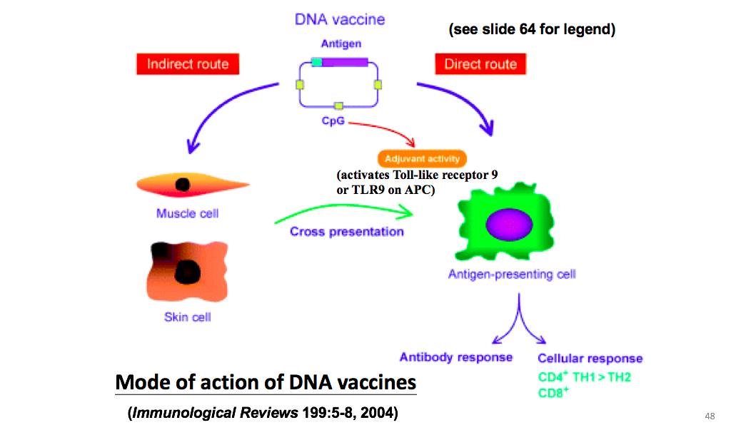 DNA疫苗,可以用不同方式送递,可能是裸露的DNA,也可能把它包被进纳米颗粒。DNA疫苗可以直接作用于抗原呈递细胞,或者间接做肌肉注射/皮下注射后再把抗原呈递给抗原呈递细胞,去激活B细胞和T细胞,分别激活抗体免疫和细胞免疫。所以DNA疫苗的优点是可以同时激活细胞免疫和体液免疫。