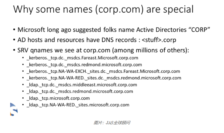 2019 年,对 DNS 名称空间冲突进行过长期研究的安全专家杰夫·施密特(Jeff Schmidt)和其他专业人士做了一个“危险的实验”。他们每天记录并分析流向 Corp.com 的企业内部流量,八个月后,施密特发现超过 375000 台 Windows 电脑端正在尝试发送信息,包括尝试登录内部公司网络以及访问网络上特定共享文件。