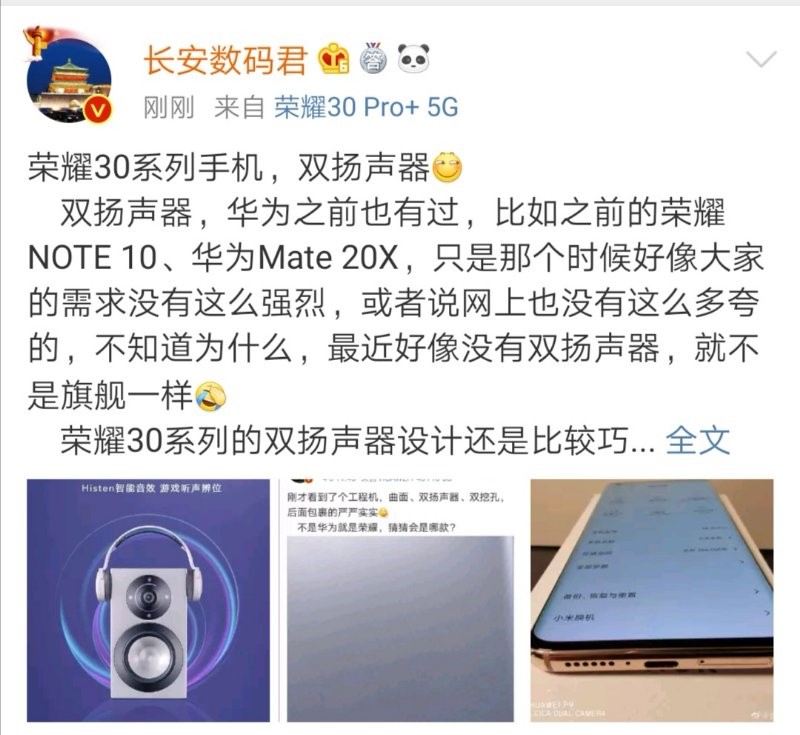 根据@长安数码君的描述,荣耀30系列的双扬声器位置十分贴心,横屏操作时不会被用户的手掌所遮挡,当播放音乐,或者在看剧打游戏的时候,采用双扬声器的手机往往能带来更大的声场,和更立体细腻雄浑的效果,特别是在封闭和寂静无人的地方,双扬声器往往能带来纯净和沉浸式的体验。