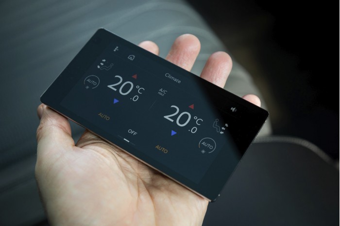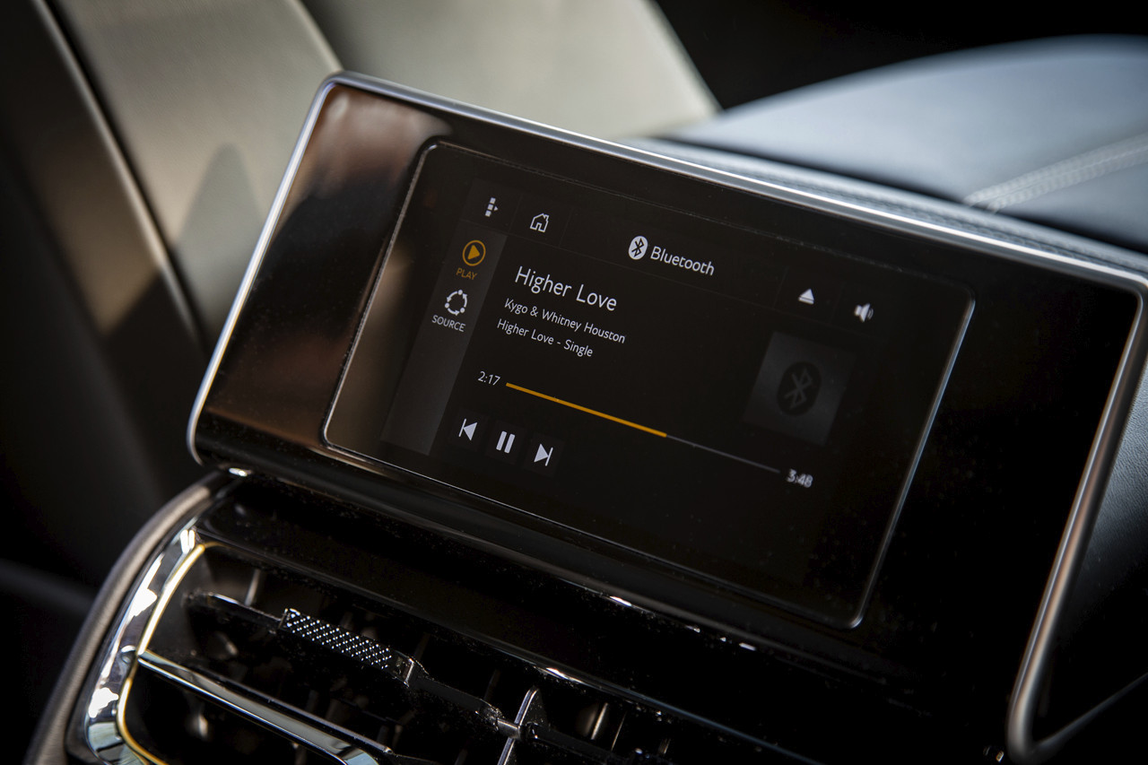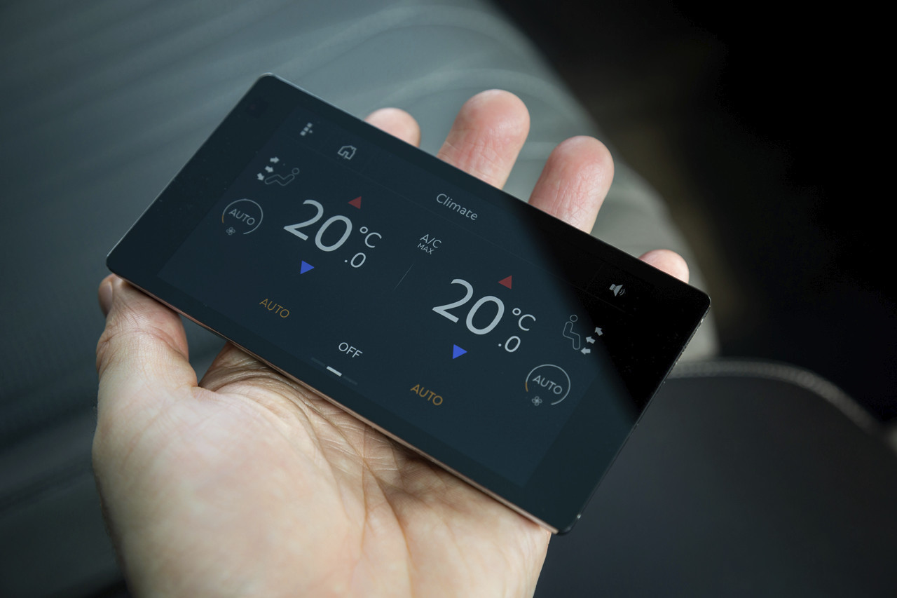 当用户按下一个按钮,遥控器就会从后排中控台顶部展开,它被集成的磁铁固定在,方便后座乘客在需要时使用。遥控器采用了四核处理器和1GB的板载内存。显示屏的分辨率为1280×720,内建一系列的传感器,包括三轴加速计和接近传感器以及触觉反馈,使遥控器的使用更加简单直观。