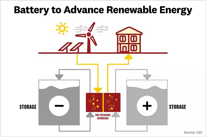 为了给可再生能源找到更加合适的存储方案,南加州大学(USC)的研究人员们,已经开发出了一种新型氧化还原液流电池。其特点是基于廉价且易于获得的材料制成,研究主要作者称:“我们已经展示了一种低成本、长寿命、安全、且环保的液流电池,对于太阳能和风能的大规模存储具有极大的吸引力”。