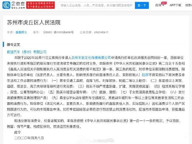 4月10日,北京长城华冠汽车科技股份有限公司董事长陆群被限制高消费。企查查显示,陆群共有苏州市虎丘区人民法院的两条被限制高消费动态,立案日期分别为2020-03-11和2020-03-17。