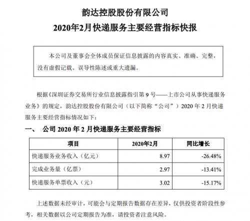 对于韵达来说,其整体的发展较为稳健,但是,有一点也需要清楚的认识到,那就是现在通达系70%的快件都是来自于阿里以及拼多多这样的电商平台。受到疫情的影响,韵达的经营受到了一定影响,这时候选择“站队”,也算是对未来的一种提前选择。数据显示,2月份,韵达快递业务量为2.97亿票,同比下滑13.41%;单票收入为3.02元,同比下滑15.17%。