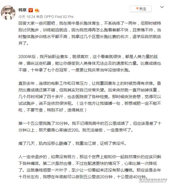 4月8日,韩寒在微博发布自己跑步的数据截图,图上显示韩寒跑5公里仅用了18分钟,随后“韩寒18分钟跑5公里”上了热搜,网友们都在感叹韩寒真是“业余大神”。对此韩寒今日发布长文回应,讲述自己从放弃长跑开始赛车到去年重拾长跑的心路历程。