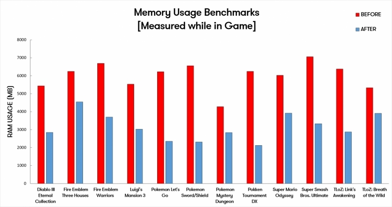 从官方公布的更新前后内存占用实测图表来看,受益的游戏包括但不限于《暗黑3》《火焰纹章》《精灵宝可梦》《超级马力欧:奥德赛》《塞尔达传说》《路易鬼屋》等等。
