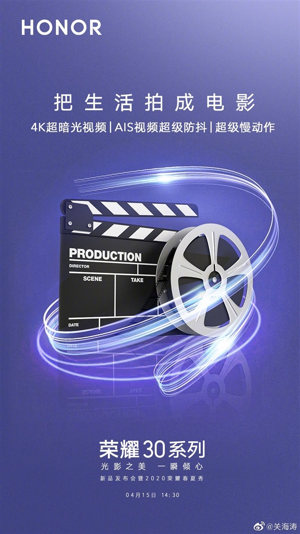 荣耀营销部副部长关海涛则曝料,荣耀30系列将支持4K超暗光视频、AIS视频超级防抖、1920FPS超级慢动作视频等,可以把生活拍成电影。