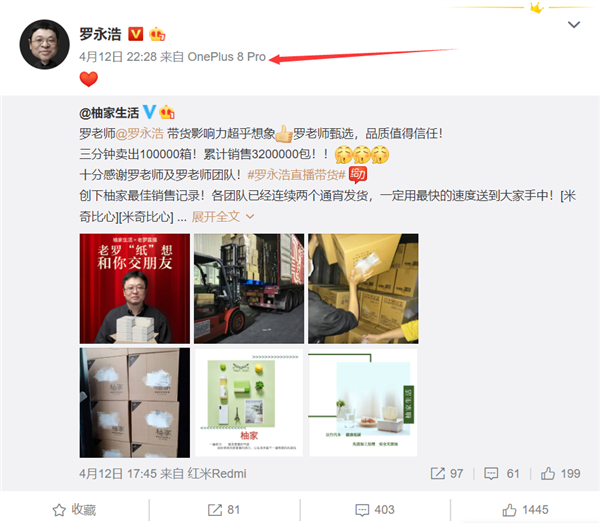 4月12日晚间,锤子科技CEO罗永浩使用一加8 Pro转发一条微博。有网友留言,罗老师要直播带货一加手机了?据悉,一加8系列将于4月16日正式发布,包括一加8、一加8 Pro两款。