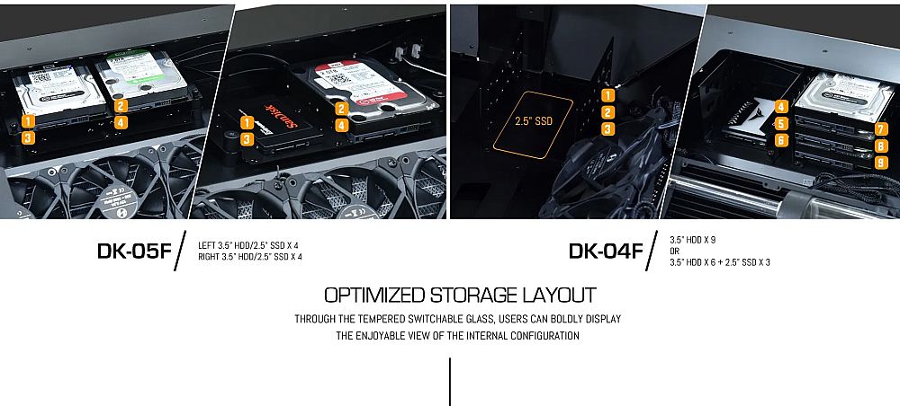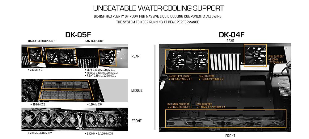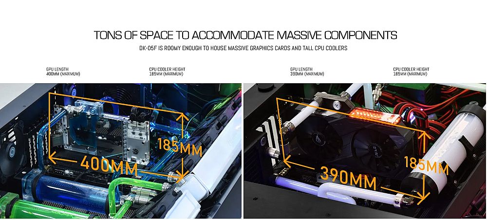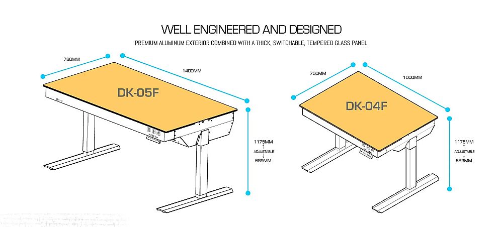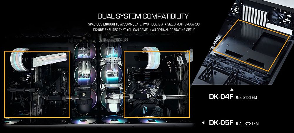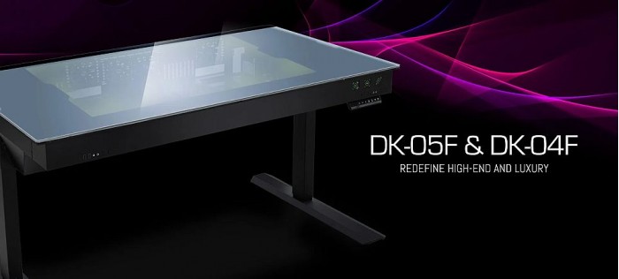 最新推出的DK-05F电脑桌机箱可以同时容纳两块E-ATX主板,而DK-04F只能容纳1台系统。两个升级款电脑桌都可以调节高度,范围是69到117.5厘米,都可以容纳液冷散热,显卡长度达到390mm甚至400mm,还可以容纳几块3.5英寸的硬盘,支持140mm的风扇。