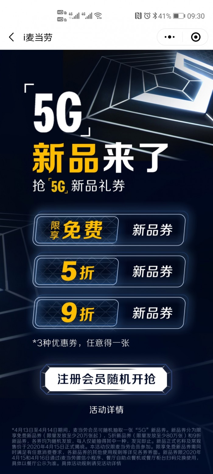 据悉,4月13日-14日,麦当劳注册会员可随机抽取一张“5G”新品券。限享免费、5折券分别限量发放20万张、80万张。