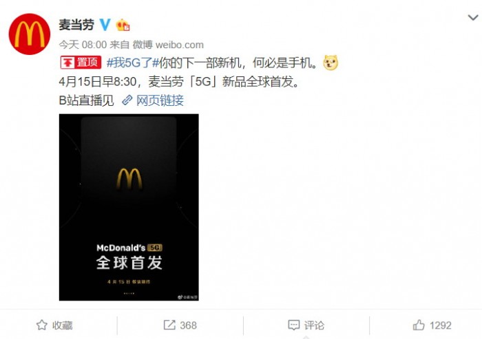 今日(4月13日)麦当劳官微发布新品预热海报,宣布麦当劳“5G”新品将于4月15日早8:30全球首发。消息一出网友热烈讨论:“我觉得是新鸡?而不是新机?”“五G,可能是五个鸡腿桶?或者五个鸡翅桶?”“5个G块?”“五个G腿,五个G翅都有可能。”