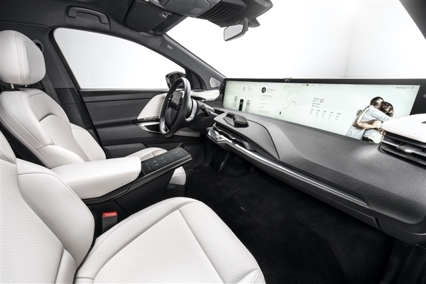 车内最大的亮点在于二合一的超大尺寸中控屏,对角线尺寸达到了48英寸,分辨率为3840*720。支持分屏显示,包括仪表信息、娱乐媒体、实时导航等常用功能。除了能够触屏操作之外,还可以进行手势识别,非常科技智能。