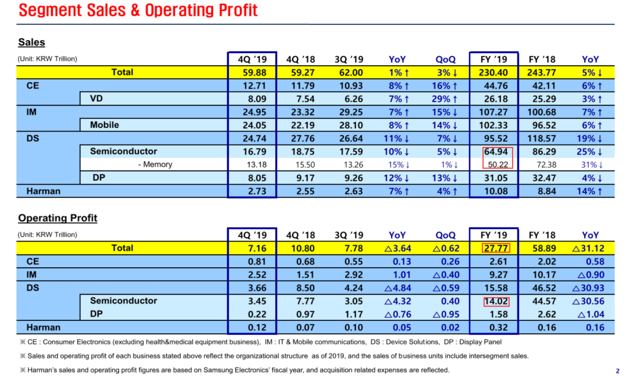 真正能暴露出三星电子2019年真实处境的,是其惨遭腰斩的盈利表现。2019年全年三星电子实现营业利润为28万亿韩元,同比减少53%,全年净利润22万亿韩元(约合180亿美元),同比暴跌51%,迎来至少十年来最大的利润降幅。