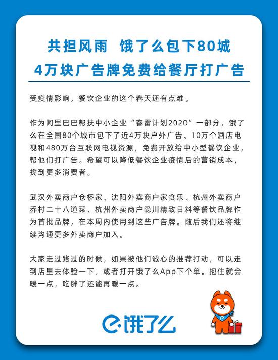 饿了么宣布在全国80个城市包下了近4万块户外广告、10万个酒店电视广告位和480万台互联网电视资源,全部免费开放给各地中小餐饮商家,帮他们播放广告。作为阿里巴巴帮扶中小企业“春雷计划2020”的组成部分之一,饿了么表示,希望可以藉此进一步降低餐饮企业疫情后的营销成本,尤其是帮助中小餐饮商家找到更多消费者。