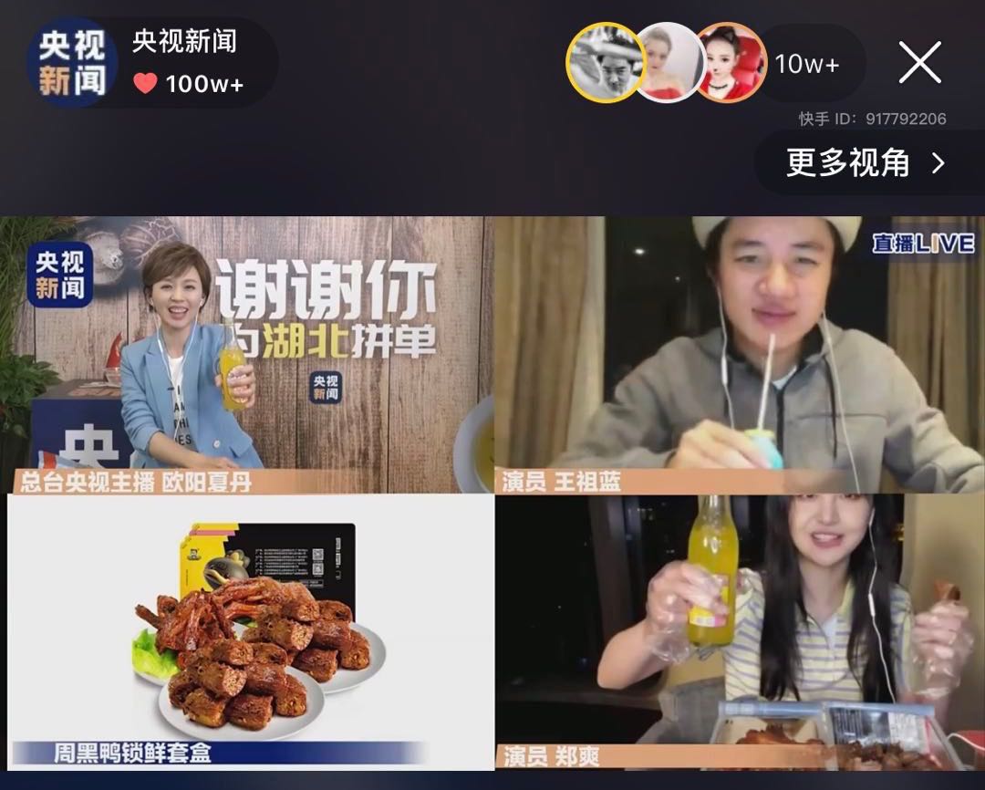 4月12号晚上20点到22点,快手联合央视新闻举办公益直播活动,售卖湖北商品。央视主持人欧阳夏丹化身“带货官”与演员王祖蓝组成“谁都无法祖(阻)蓝(拦)我夏(下)丹(单)”组合在快手上演了带货首秀。此外,演员蔡明、郑爽也加入了为湖北带货的行列。