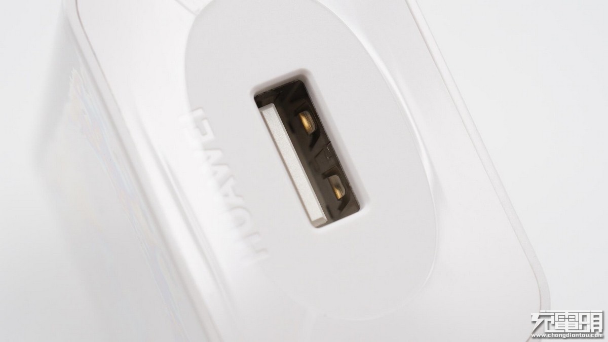 充电器输出顶面配有USB-A接口,白色胶芯,旁边凹印HUAWEI品牌。