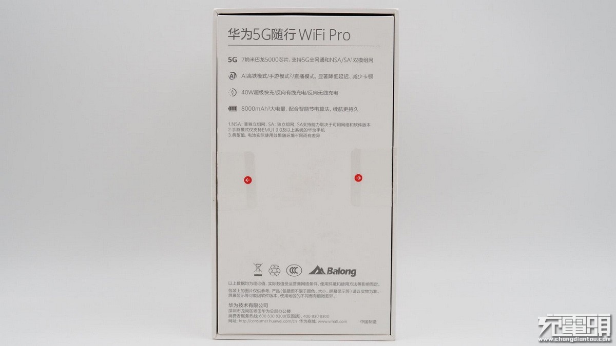 包装盒内除了华为5G随行WIFI Pro外,还有40W SuperCharge充电器、数据线和使用说明书。