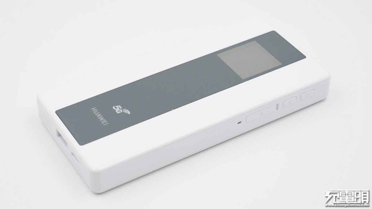 华为5G随行WIFI Pro机身扁平修长,边角设计圆润不硌手,机身正面一端配有1.45英寸LCD显示屏,另一端印有HUAWEI品牌和5G字样。