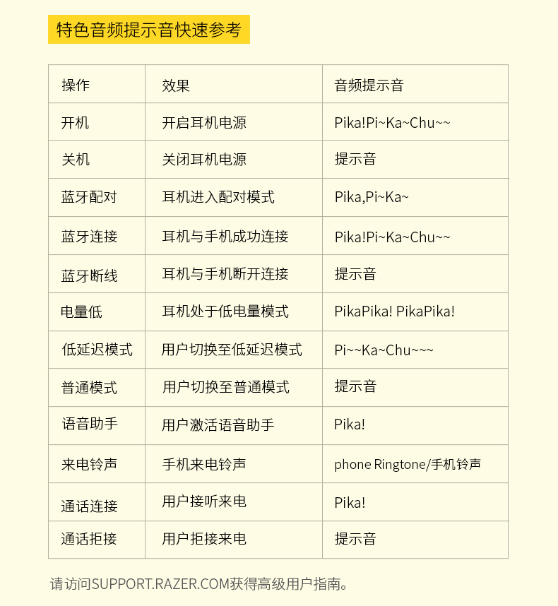 此外,操作耳机时的音频提示也被“皮卡丘化”,例如开启耳机电源时的提示音为“Pika!Pi~Ka~Chu~”,蓝牙配对时的提示音为“Pika,Pi~Ka~”等等。